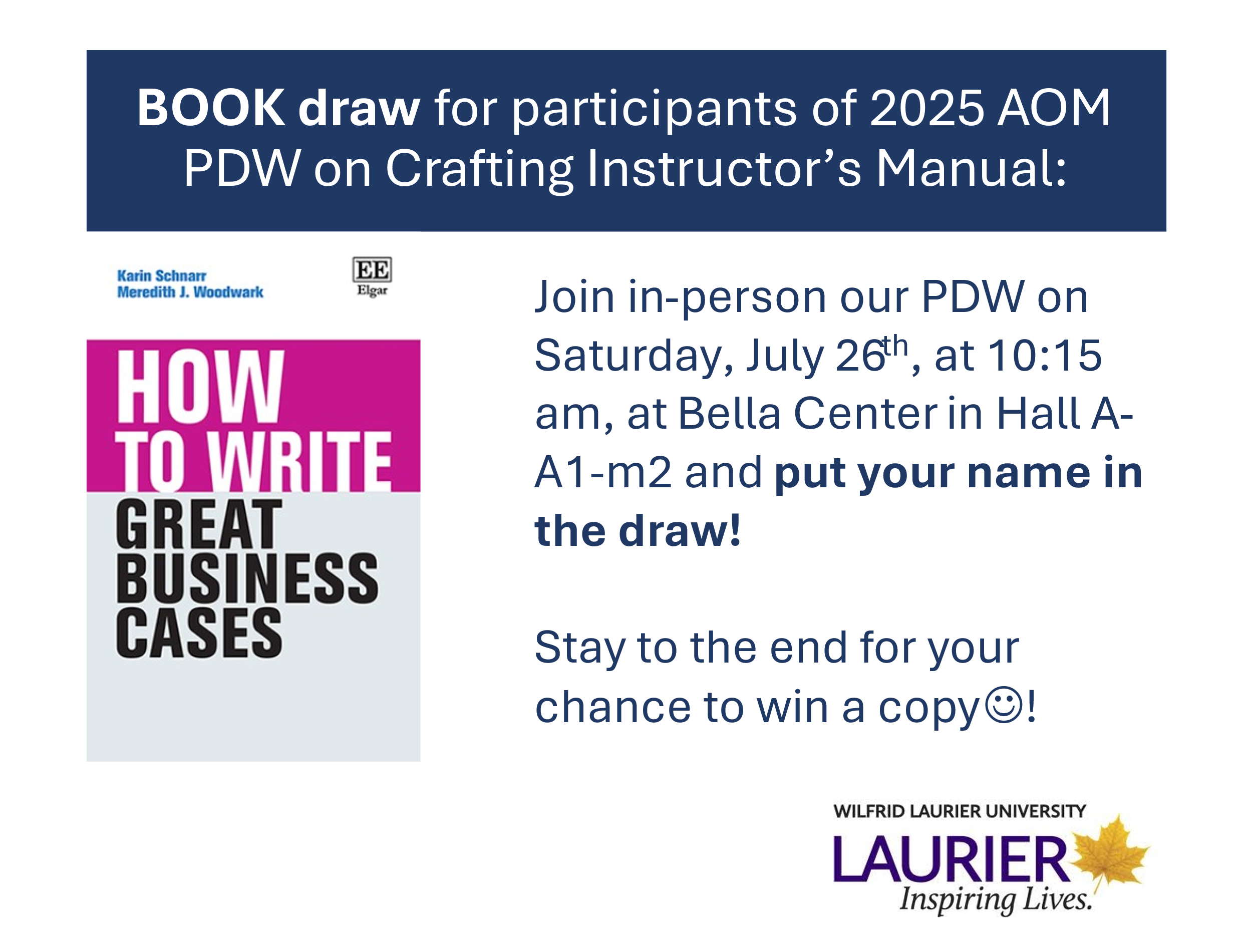 Last but not least (!) - by attending in-person, you may enter your name into the draw to win a free copy of the book "How to Write Great Business Cases" by Karin Schnarr (former Track Chair for Strategy and Policy at NACRA) and Meredith Woodwark (Associate Editor of the Case Research Journal). The winner will be revealed at the end of the PDW!